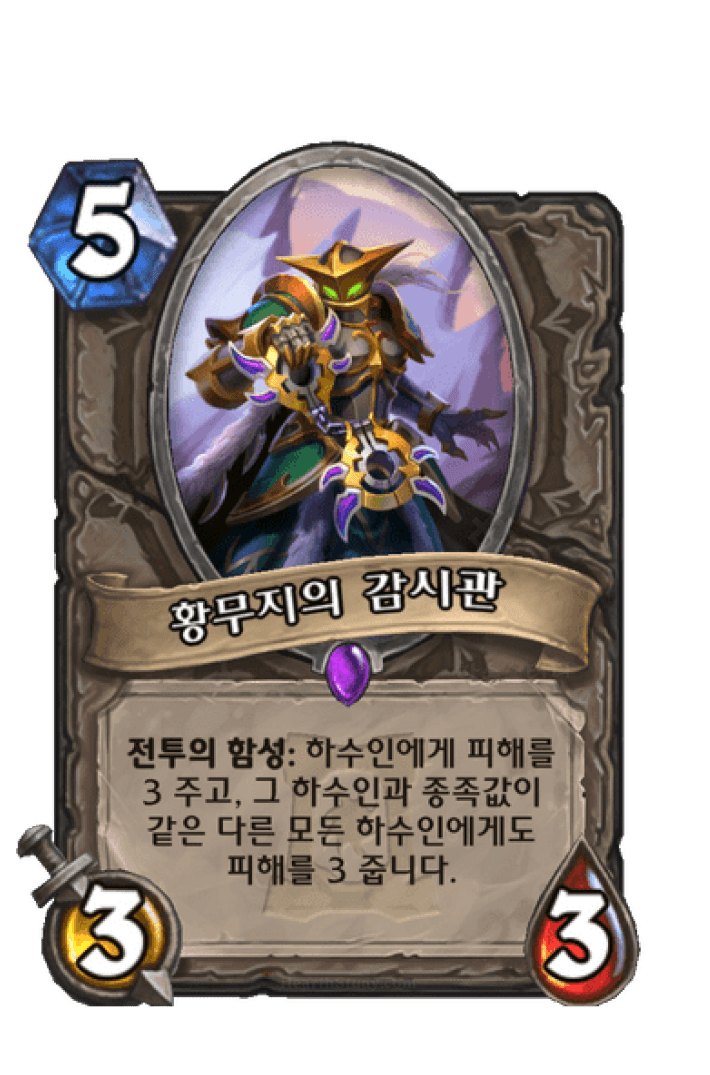전투의 함성: 하수인에게 피해를 3 주고, 그 하수인과 종족값이 같은 다른 모든 하수인에게도 피해를 3 줍니다.