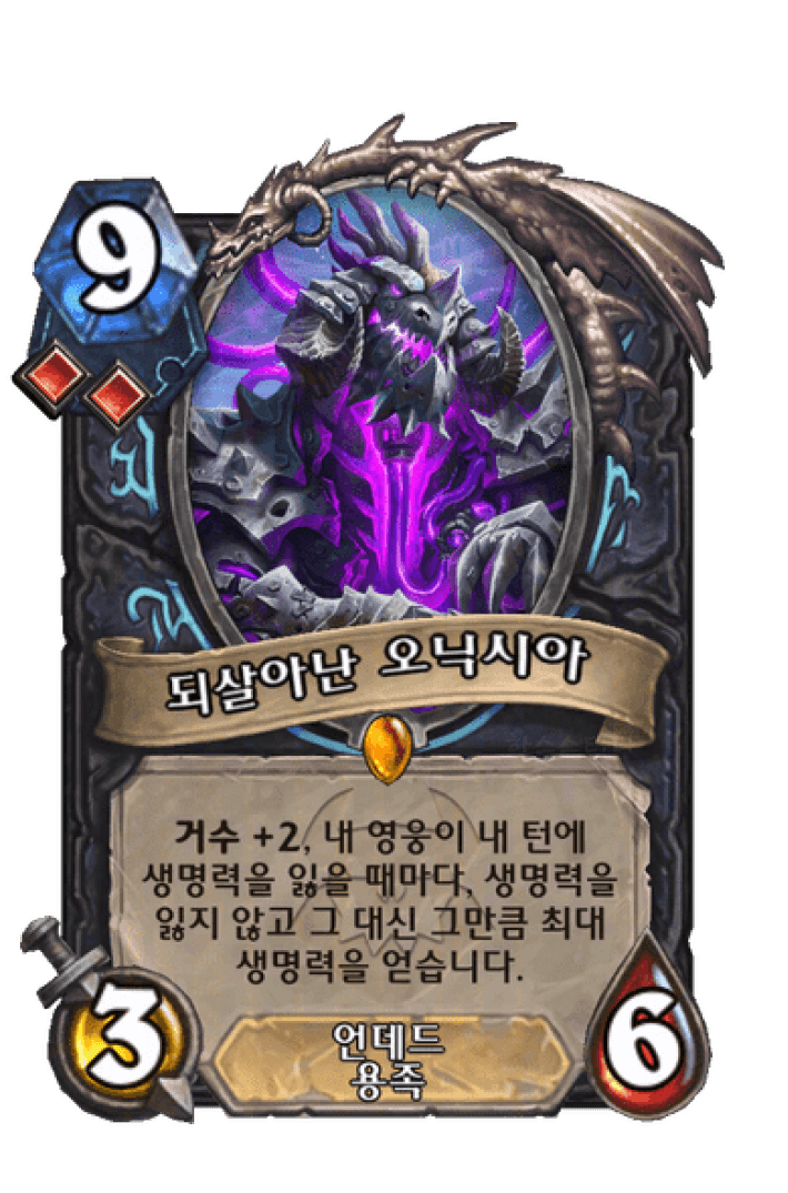 거수 +2, 내 영웅이 내 턴에 생명력을 잃을 때마다, 생명력을 잃지 않고 그 대신 그만큼 최대 생명력을 얻습니다.