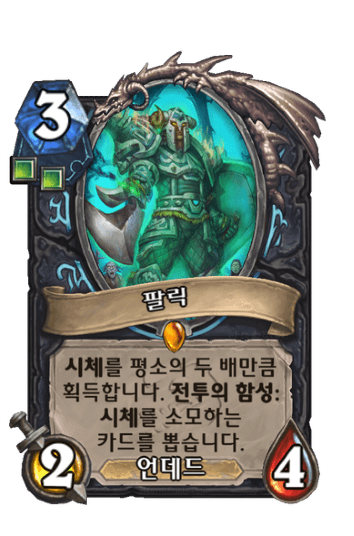 시체를 평소의 두 배만큼 획득합니다. 전투의 함성: 시체를 소모하는 카드를 뽑습니다.