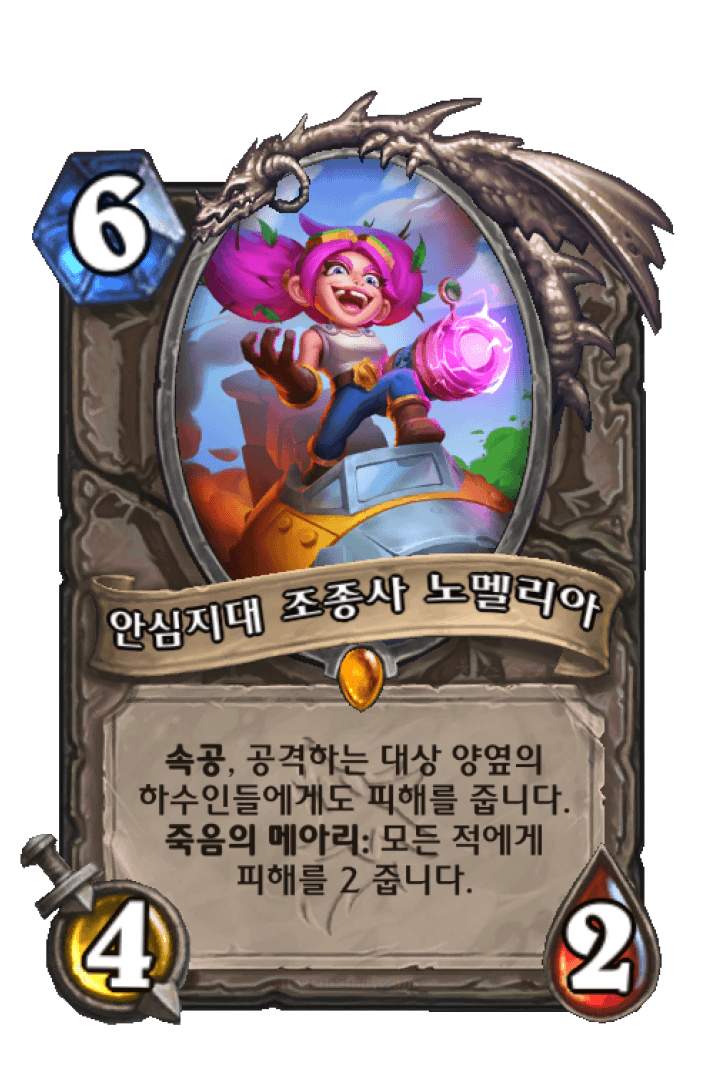 속공, 공격하는 대상 양옆의 하수인들에게도 피해를 줍니다. 죽음의 메아리: 모든 적에게 피해를 2 줍니다.