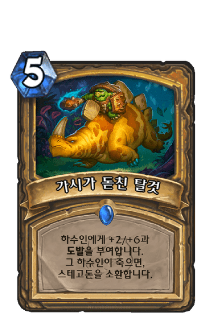 하수인에게 +2/+6과 도발을 부여합니다.그 하수인이 죽으면, 스테고돈을 소환합니다.