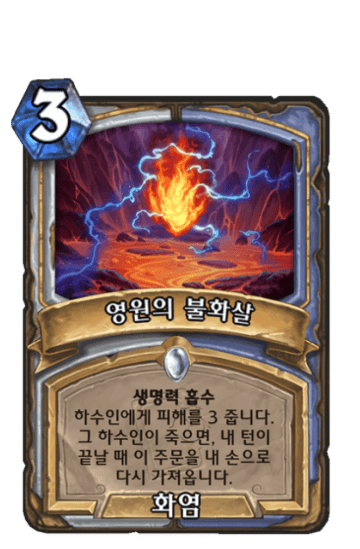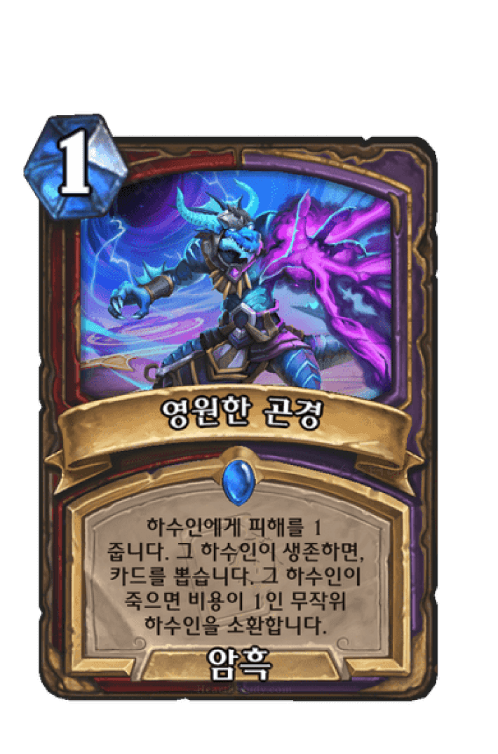 하수인에게 피해를 1 줍니다. 그 하수인이 생존하면, 카드를 뽑습니다. 그 하수인이 죽으면 비용이 1인 무작위 하수인을 소환합니다.