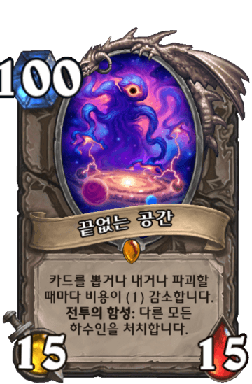 카드를 뽑거나 내거나 파괴할 때마다 비용이 (1) 감소합니다. 전투의 함성: 다른 모든 하수인을 처치합니다.
