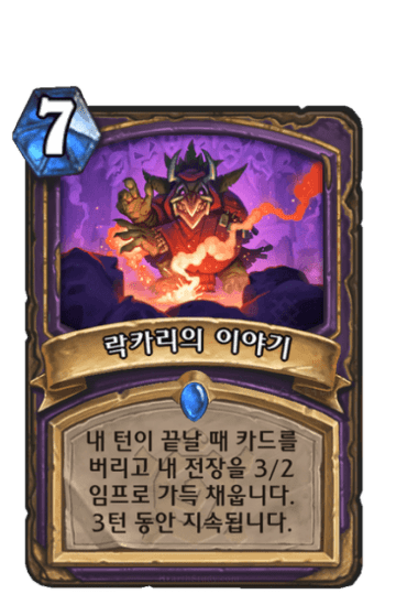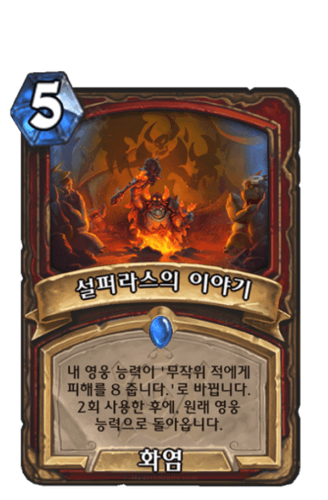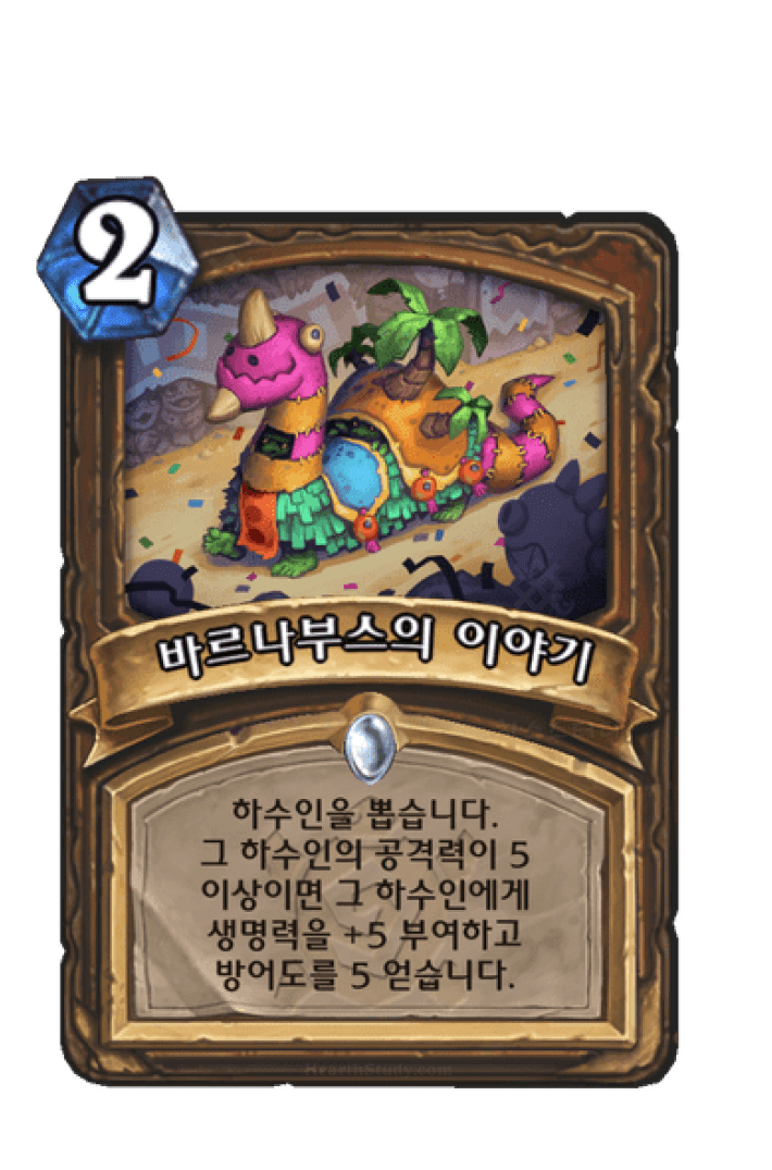 그 하수인의 공격력이 5 이상이면 그 하수인에게 생명력을 +5 부여하고 방어도를 5 얻습니다.
