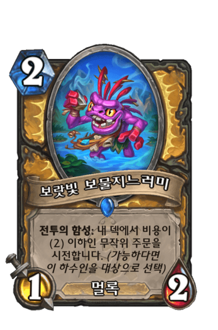 전투의 함성: 내 덱에서 비용이(2) 이하인 무작위 주문을시전합니다. (가능하다면이 하수인을 대상으로 선택)