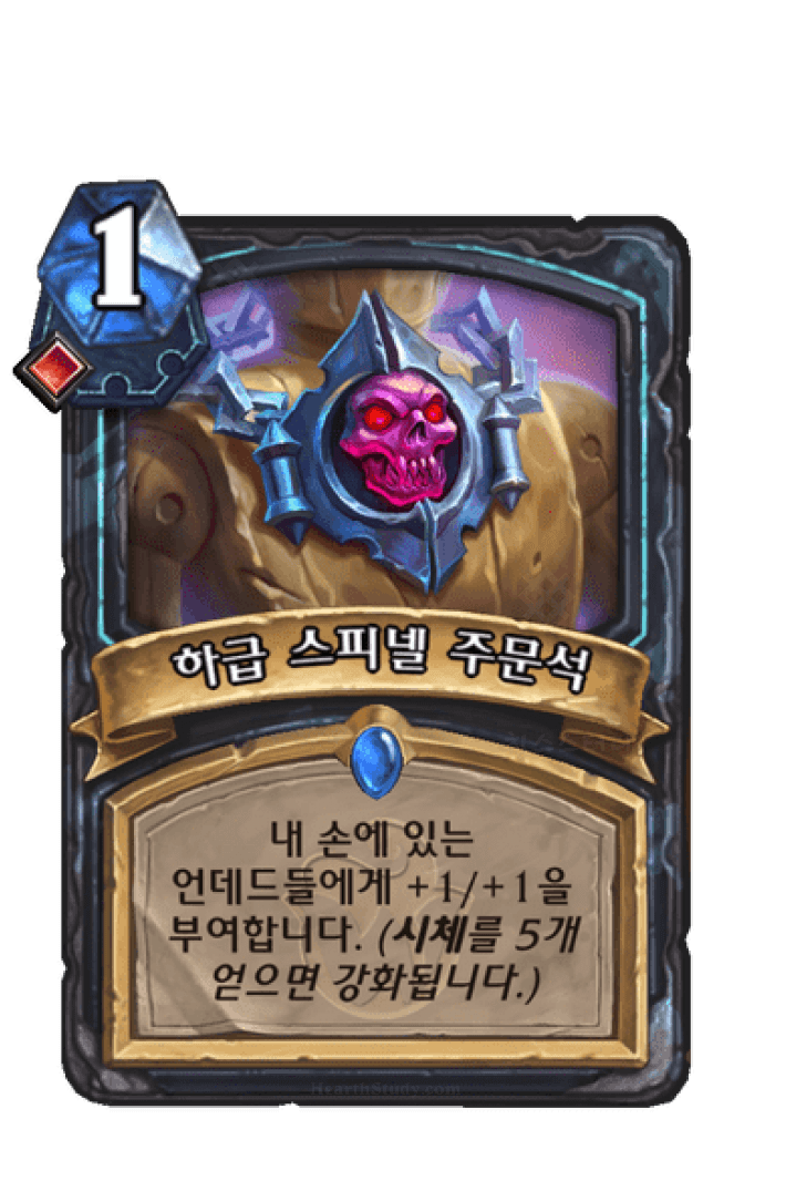 내 손에 있는 언데드들에게 +1/+1을 부여합니다. (시체를 5개 얻으면 강화됩니다.)