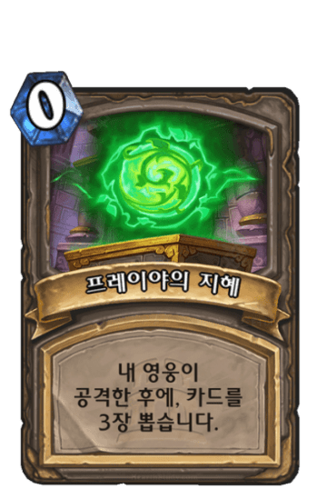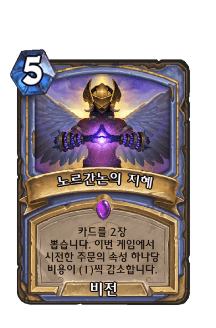 카드를 2장 뽑습니다. 이번 게임에서 시전한 주문의 속성 하나당 비용이 (1)씩 감소합니다.