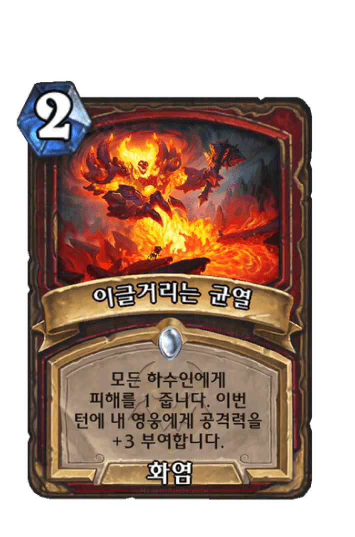 모든 하수인에게 피해를 1 줍니다. 이번 턴에 내 영웅에게 공격력을 +3 부여합니다.
