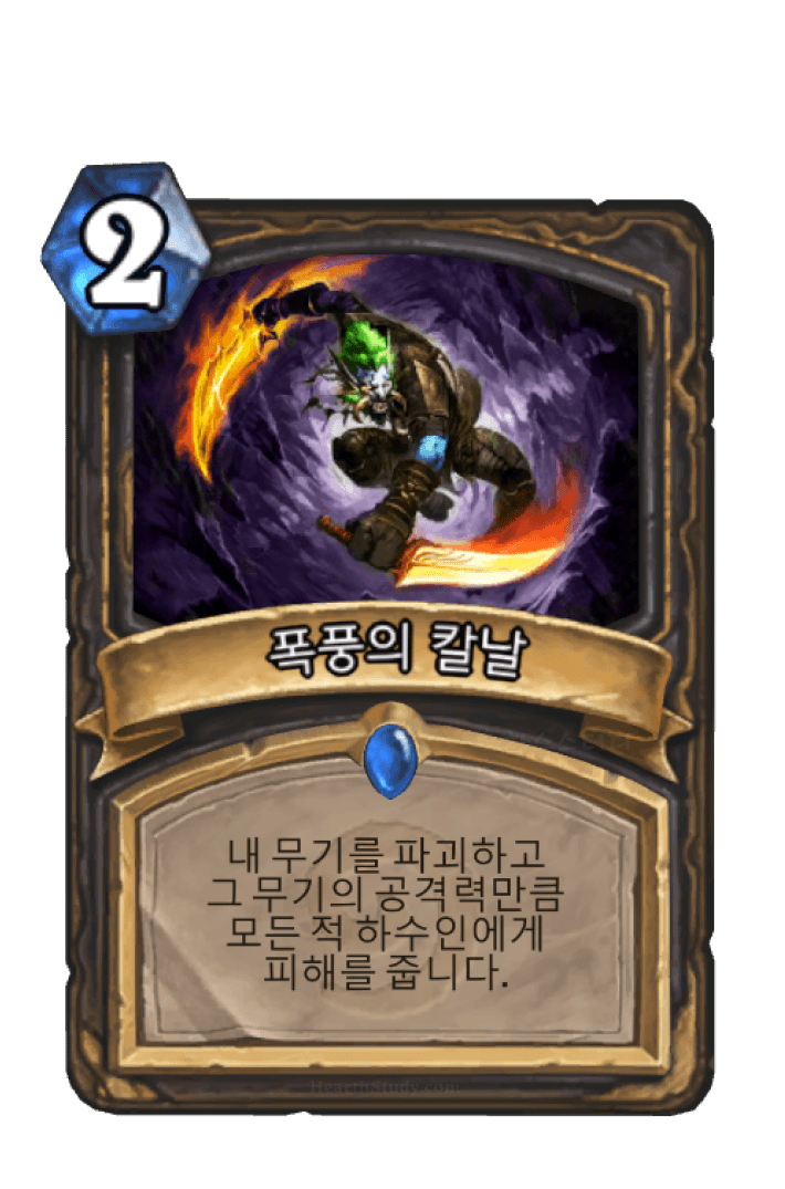 내 무기를 파괴하고 그 무기의 공격력만큼 모든 적 하수인에게 피해를 줍니다.
