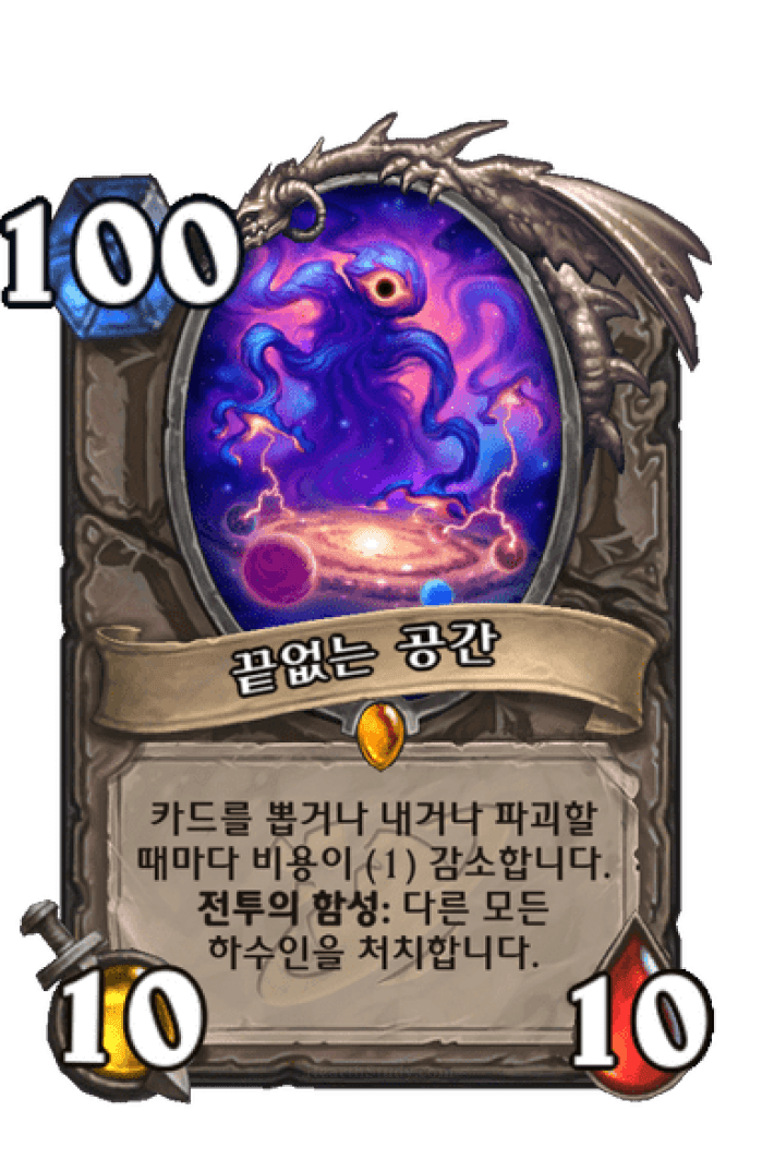 카드를 뽑거나 내거나 파괴할 때마다 비용이 (1) 감소합니다. 전투의 함성: 다른 모든 하수인을 처치합니다.