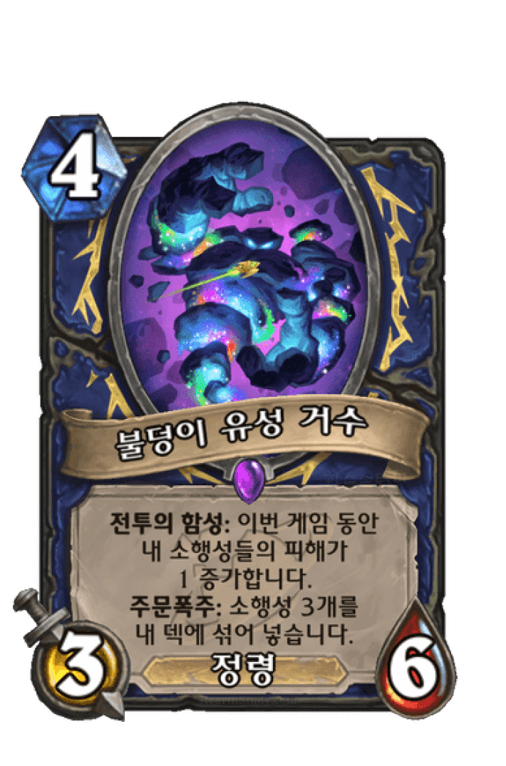 전투의 함성: 이번 게임 동안내 소행성들의 피해가1 증가합니다.주문폭주: 소행성 3개를내 덱에 섞어 넣습니다.