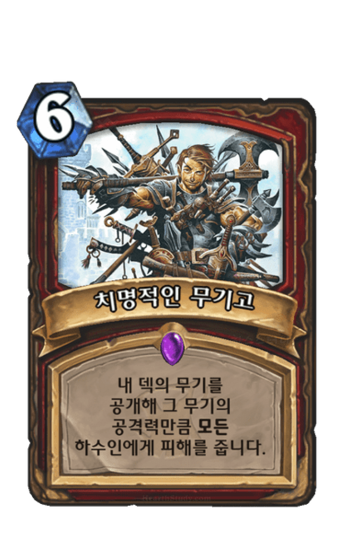 내 덱의 무기를 공개해 그 무기의 공격력만큼 모든 하수인에게 피해를 줍니다.