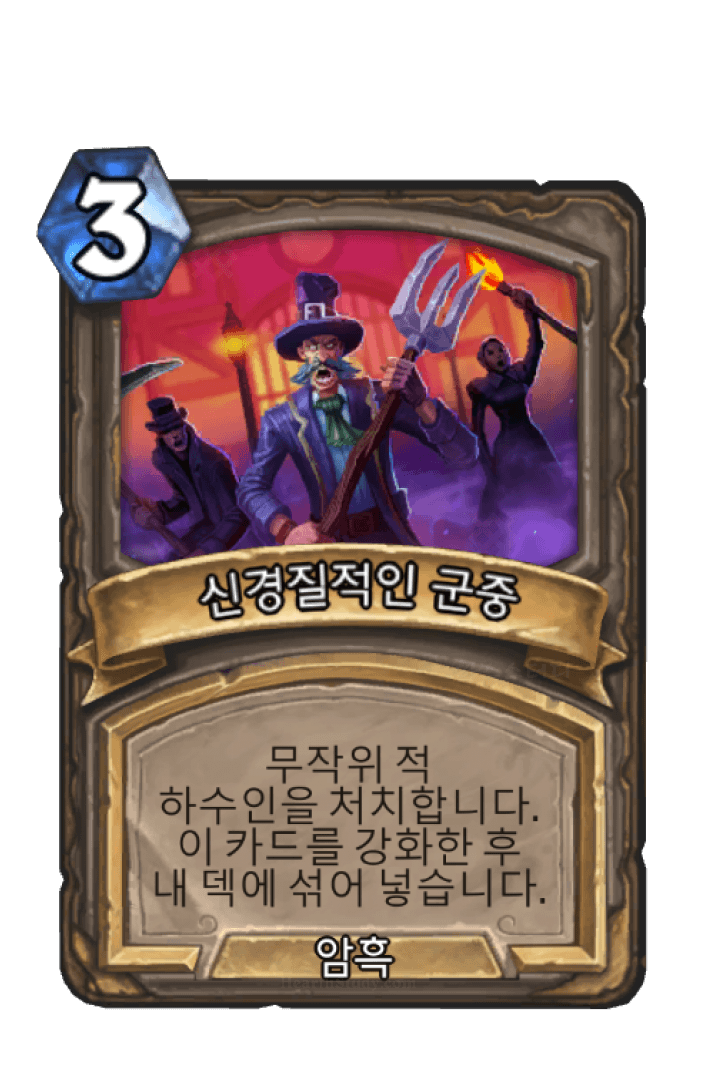 무작위 적 하수인을 처치합니다. 이 카드를 강화한 후내 덱에 섞어 넣습니다.