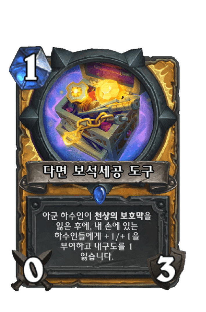 아군 하수인이 천상의 보호막을 잃은 후에, 내 손에 있는 하수인들에게 +1/+1을 부여하고 내구도를 1 잃습니다.