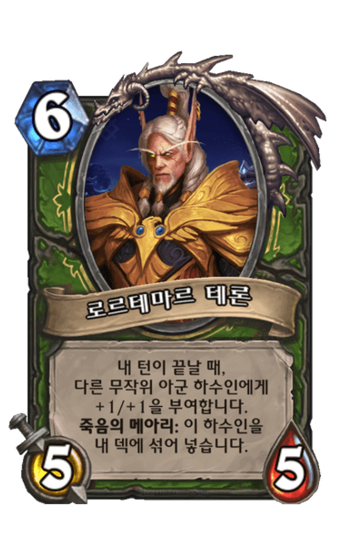 내 턴이 끝날 때,다른 무작위 아군 하수인에게+1/+1을 부여합니다.죽음의 메아리: 이 하수인을내 덱에 섞어 넣습니다.