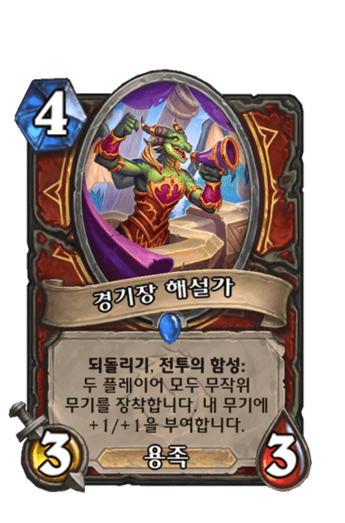 되돌리기, 전투의 함성:두 플레이어 모두 무작위 무기를 장착합니다. 내 무기에 +1/+1을 부여합니다.