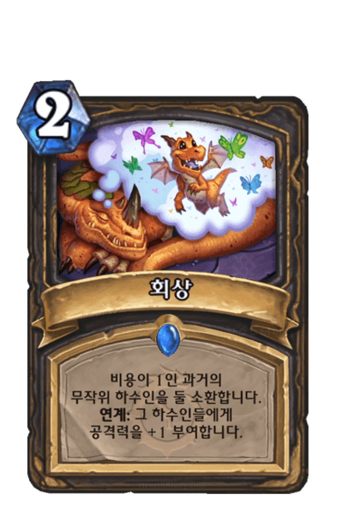 비용이 1인 과거의무작위 하수인을 둘 소환합니다.연계: 그 하수인들에게공격력을 +1 부여합니다.