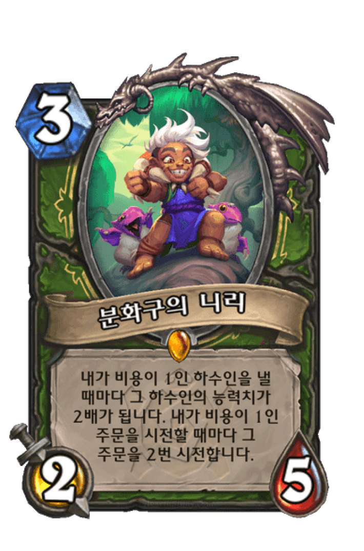 내가 비용이 1인 하수인을 낼 때마다 그 하수인의 능력치가 2배가 됩니다. 내가 비용이 1인 주문을 시전할 때마다 그 주문을 2번 시전합니다.