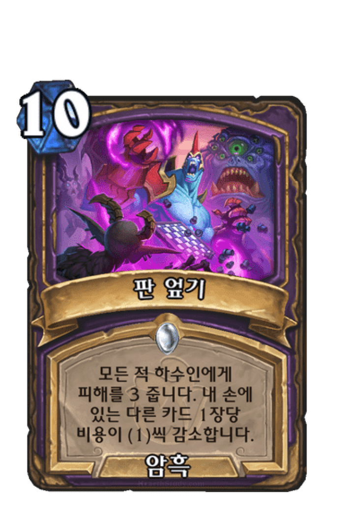 모든 적 하수인에게 피해를 3 줍니다. 내 손에 있는 다른 카드 1장당 비용이 (1)씩 감소합니다.