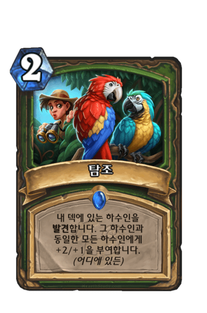 내 덱에 있는 하수인을 발견합니다. 그 하수인과 동일한 모든 하수인에게 +2/+1을 부여합니다. (어디에 있든)