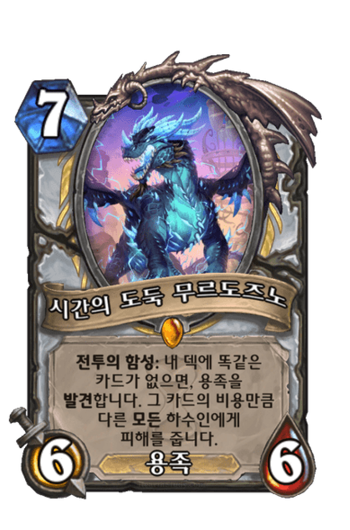 전투의 함성: 내 덱에 똑같은 카드가 없으면, 용족을 발견합니다. 그 카드의 비용만큼 다른 모든 하수인에게 피해를 줍니다.