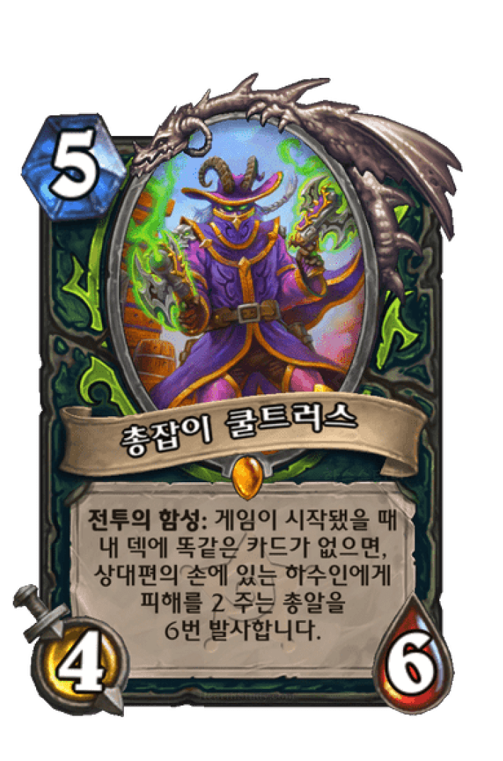 내 덱에 똑같은 카드가 없으면, 상대편의 손에 있는 하수인에게 피해를 2 주는 총알을 6번 발사합니다.